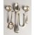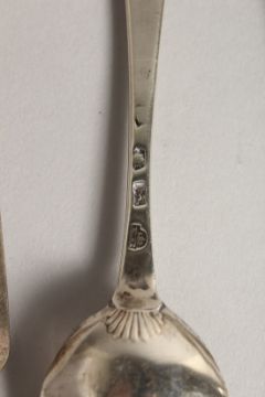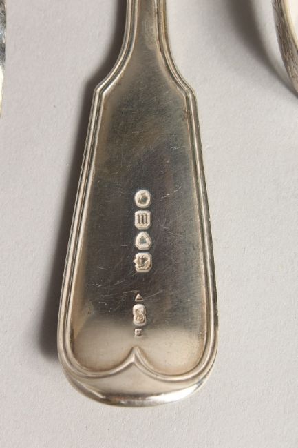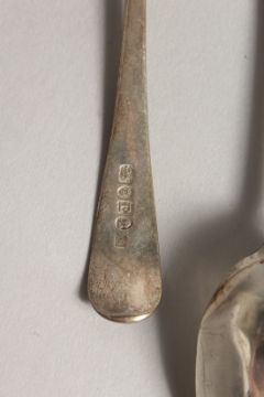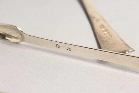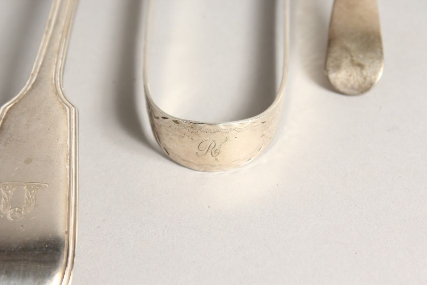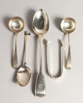 A SILVER FIDDLE PATTERN BASTING SPOON, London 1857, together with a pair of sauce ladles, London, 1800, and an early table spoon (marks rubbed), and a pair of bright cut sugar tongs (5).