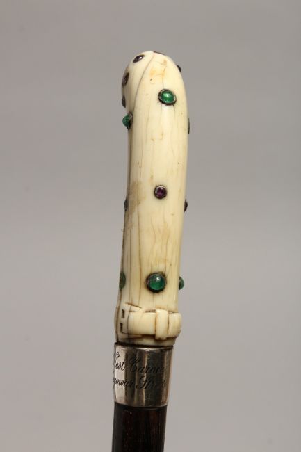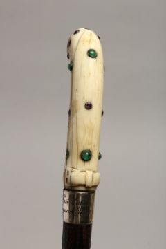 AN EDWARDIAN IVORY HANDLE WALKING CANE with silver band and cabochon stones, F. WEST CARNE, 59 Seymour Street. London, 1925. 37ins long