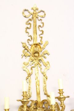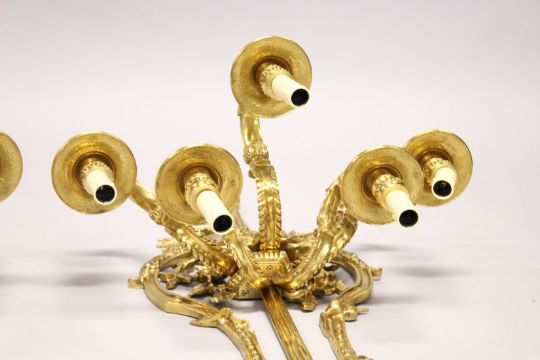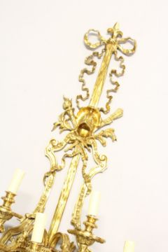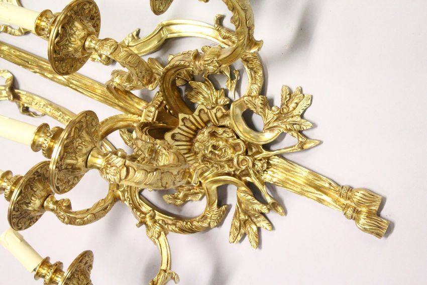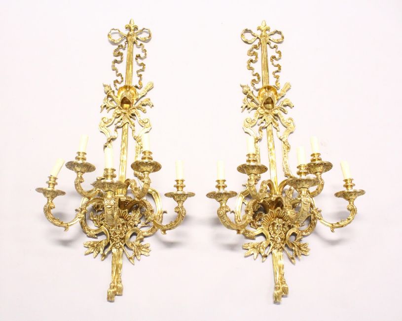 A LARGE AND IMPRESSIVE PAIR OF ORMOLU BRONZE WALL APPLIQUES, each with five scrolling branches, ribbon, swag and calssical decoration.