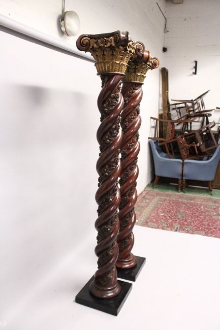 A VERY GOOD PAIR OF 18TH CENTURY CARVED SPIRAL MAHOGANY COLUMNS with carved gilded corinthian column capitals