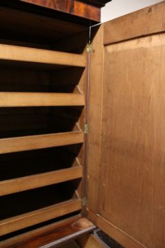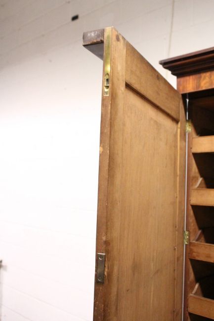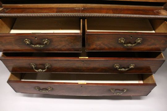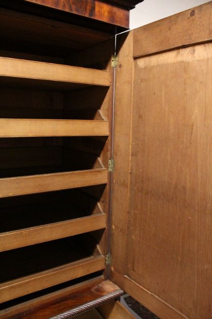 A 19TH CENTURY LINEN PRESS, with a moulded cornice above a pair of panelled doors with tuned columns, enclosing five trays above a base with two short and two long drawers on carved bun feet.