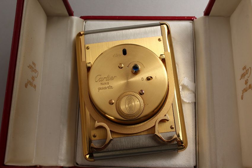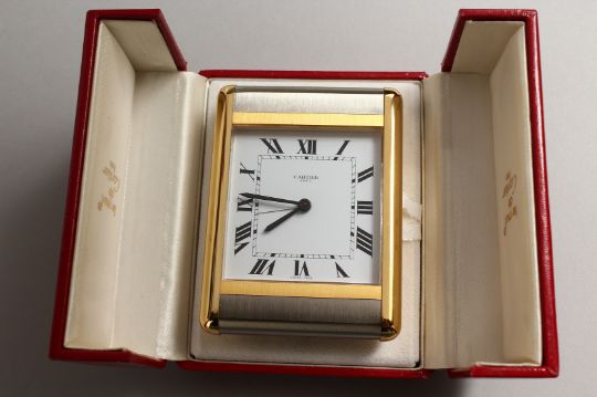 A VERY GOOD CARTIER PARIS TRAVELLING CLOCK in a red Cartier case, No. 750503920.