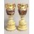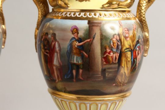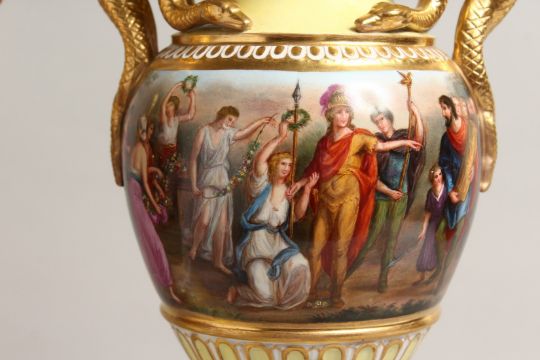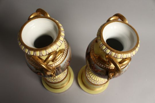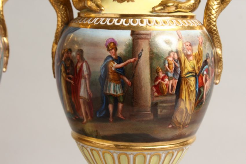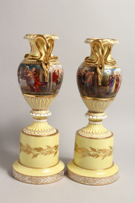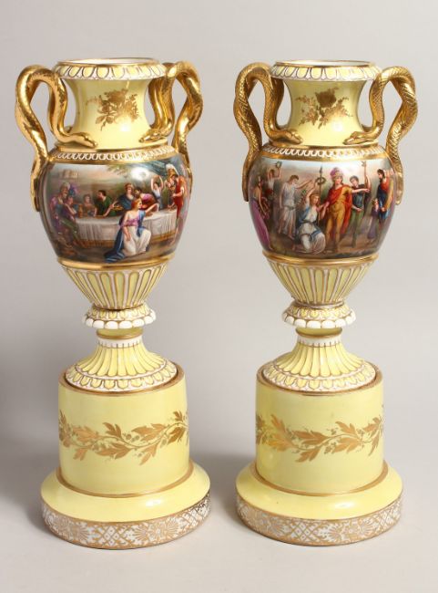 A VERY GOOD PAIR OF 19TH CENTURY YELLOW GROUP VIENNA TWO HANDLED URNS AND STANDS, with snake handles and painted with a continuous band of classical scenes.
