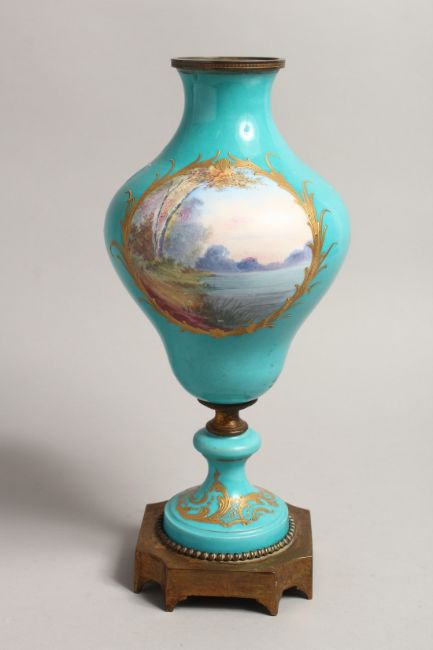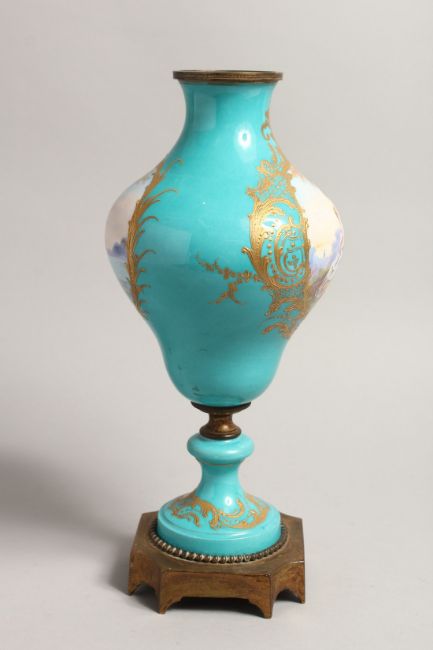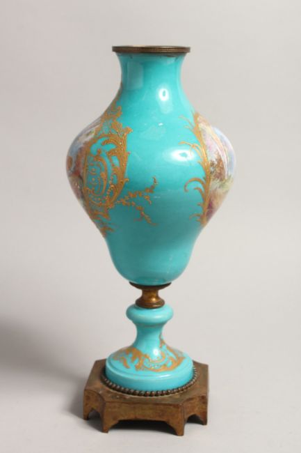 A GOOD 19TH CENTURY SEVRES BLUE GROUND LAMP BASE painted with a panel of young lovers, with ormolu mounts.