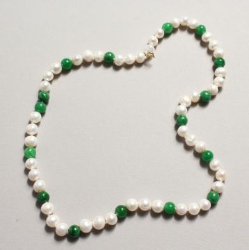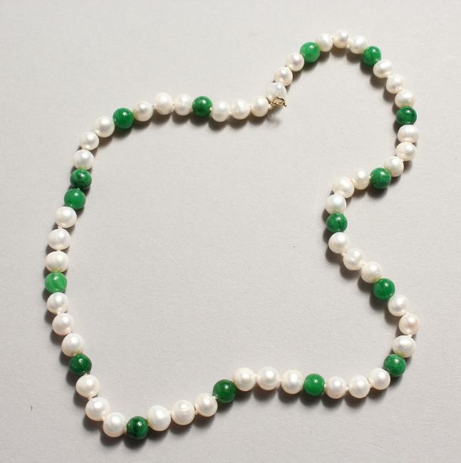 A STRING OF PEARL AND JADE BEADS with 14ct gold clasp.