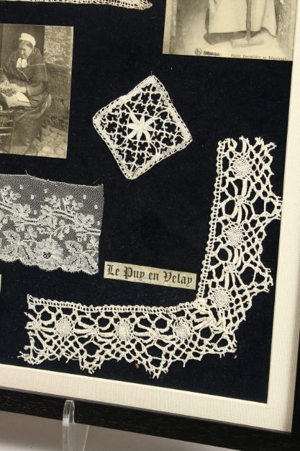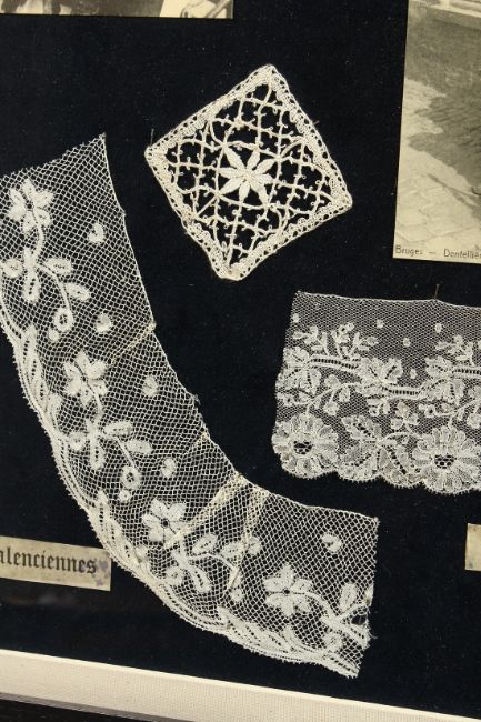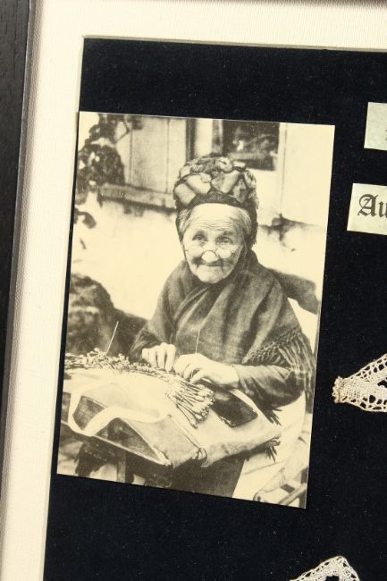SIX PIECES OF FINE WHITE LACE COLLARS, framed and glazed, from Bruges, with three photographs.
