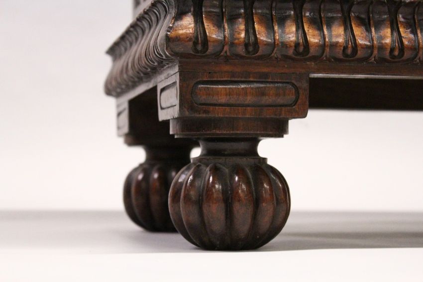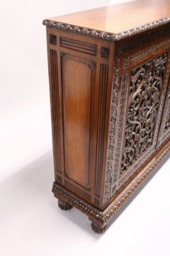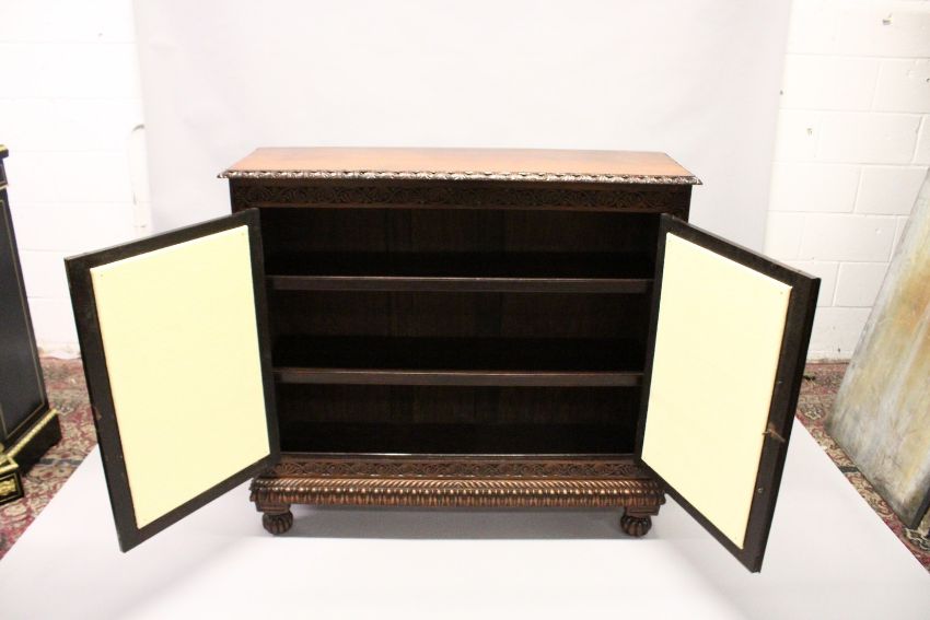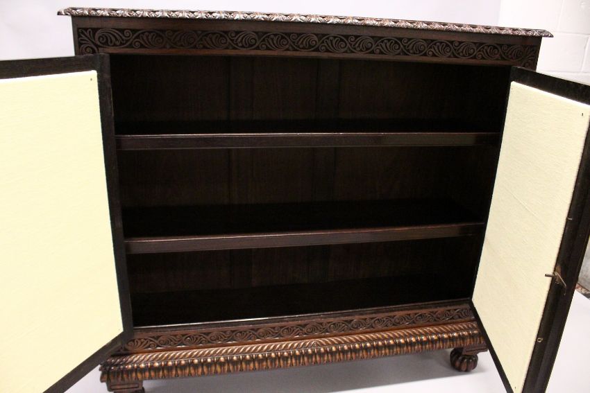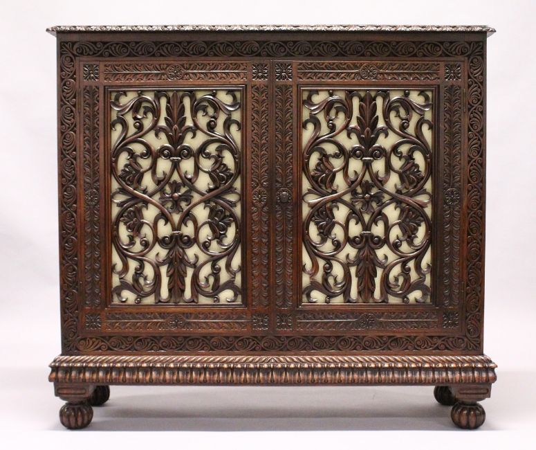 A VERY GOOD 19TH CENTURY ANGLO-INDIAN ROSEWOOD STANDING BOOKCASE with plain top, carved frieze and pierced carved double panel doors supported on four bun feet