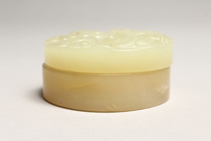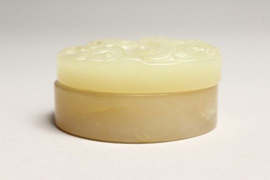A CARVED CIRCULAR JADE BOX AND COVER
