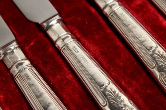 A CASED SET OF TWELVE SILVER HANDLED FRUIT KNIVES AND FORKS.
