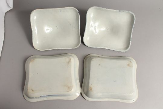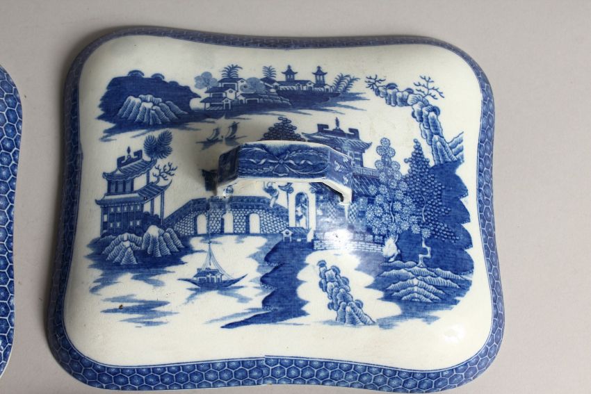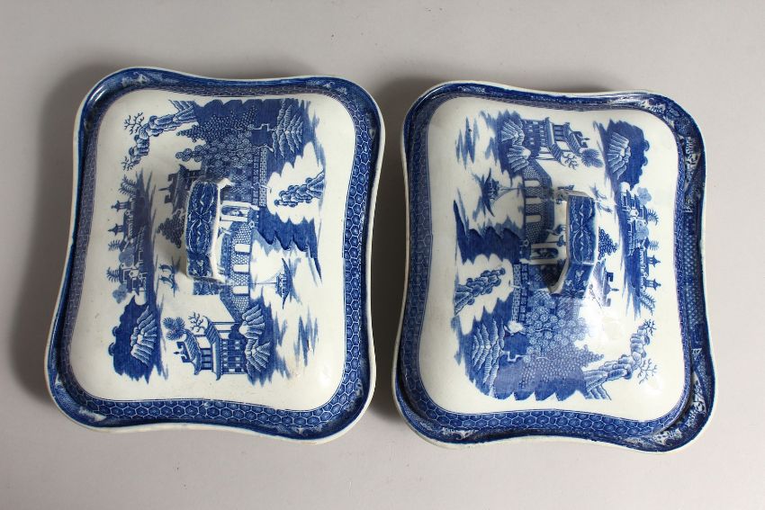 A PAIR OF BLUE AND WHITE SQUARE SHAPE TUREENS AND COVERS