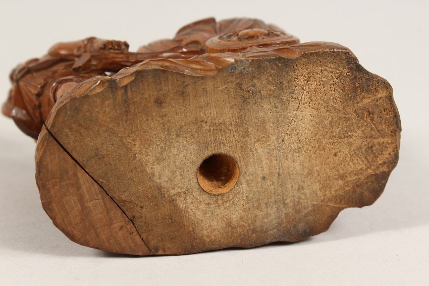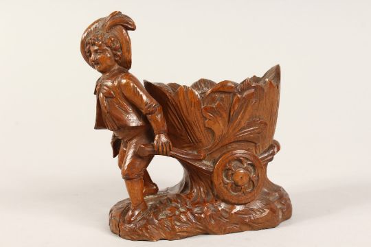 A GOOD SMALL BLACK FOREST CARVED WOOD BOY pulling a cart