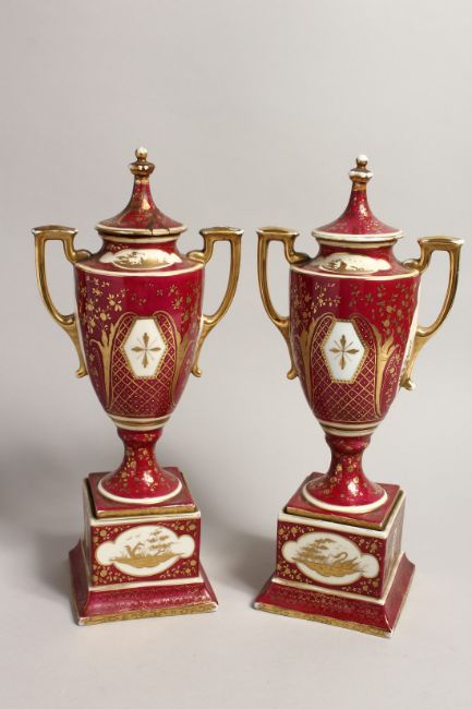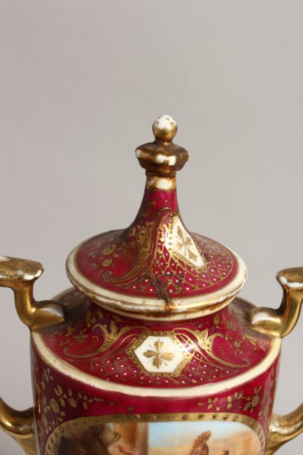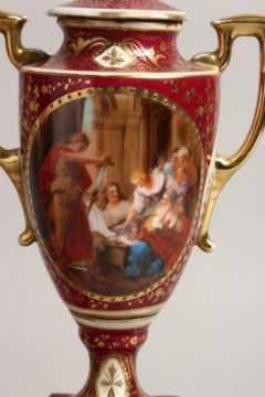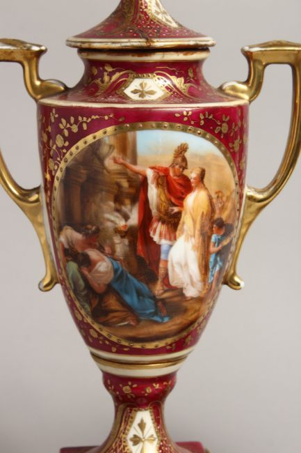 A PAIR OF 19TH CENTURY VIENNA TWO HANDLED URN SHAPE VASES AND COVERS, painted with classical scenes.
