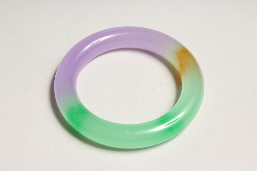A MULTI COLOURED JADE BANGLE.