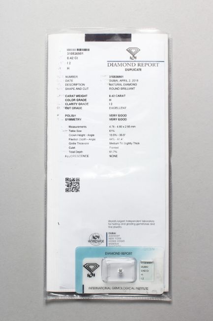 A SINGLE STONE DIAMOND 0.42 carat, colour H, clarity 12,with diamond report.