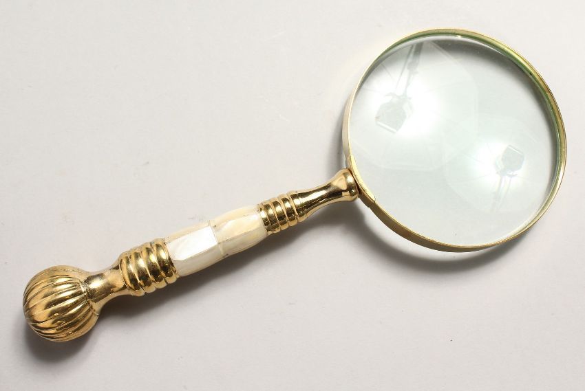A MAGNIFYING GLASS with mother of pearl and gilt handle