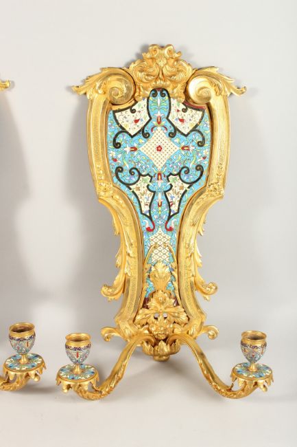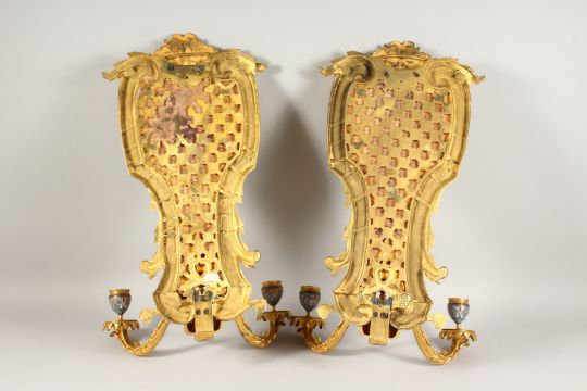 A SUPERB PAIR OF FRENCH, ORMOLU AND ENAMEL TWO LIGHT WALL SCONCES WITH ACANTHUS AND SCROLLS