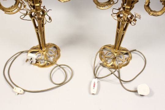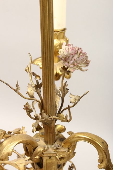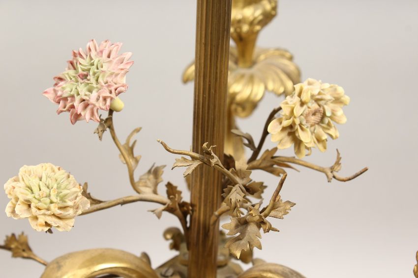 A GOOD PAIR OF FRENCH BRONZE THREE BRANCH CANDELABRA with scrolling arms and porcelain flowers