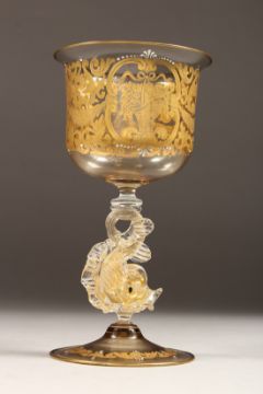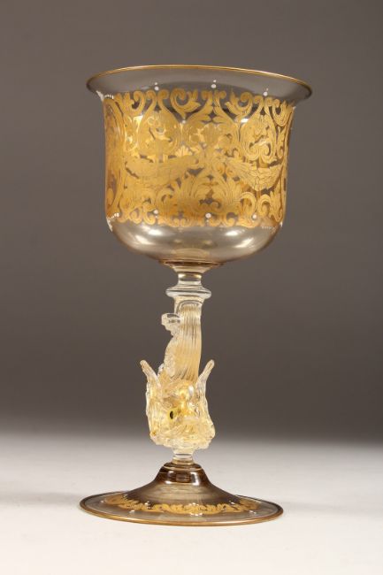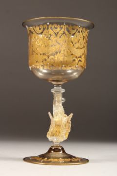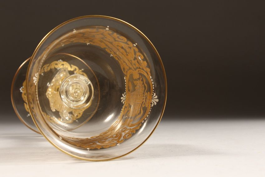 A GOOD VENETIAN GOLD DECORATED GOBLET, circa. 1920, with garlands and flowering baskets.