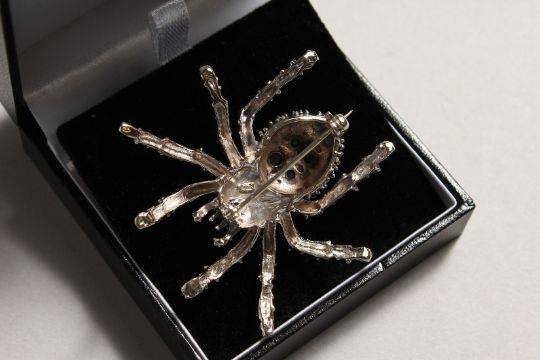 A SILVER EMERALD AND MARCASITE SPIDER BROOCH