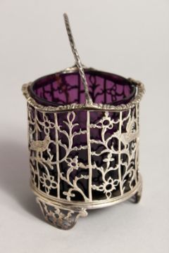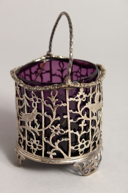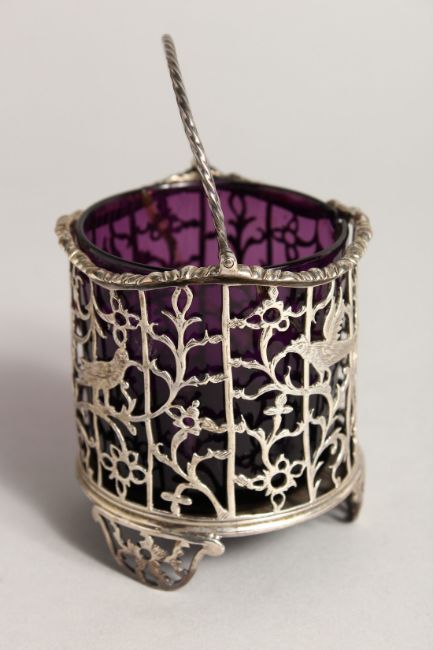 A SILVER SWING HANDLE CREAM PAIL, of open design with pierced and engraved decoration depicting birds on branches with amethyst glass liner.