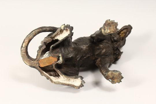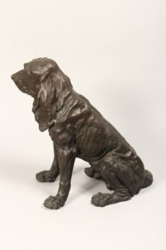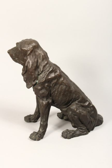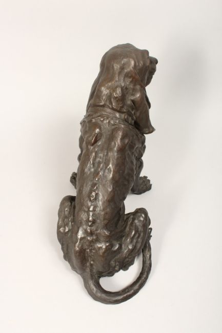 A NATURALISTICALLY MODELLED AND CAST BRONZE FIGURE OF A SEATED DOG.