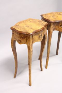 A PAIR OF FRENCH STYLE BURR WOOD SINGLE DRAWER BEDSIDE TABLES on cabriole legs