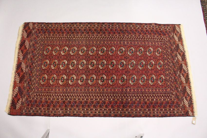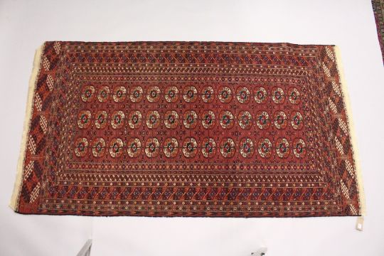A TURKOMEN TEKKE CARPET, claret ground with three rows of thirteen gulls.