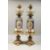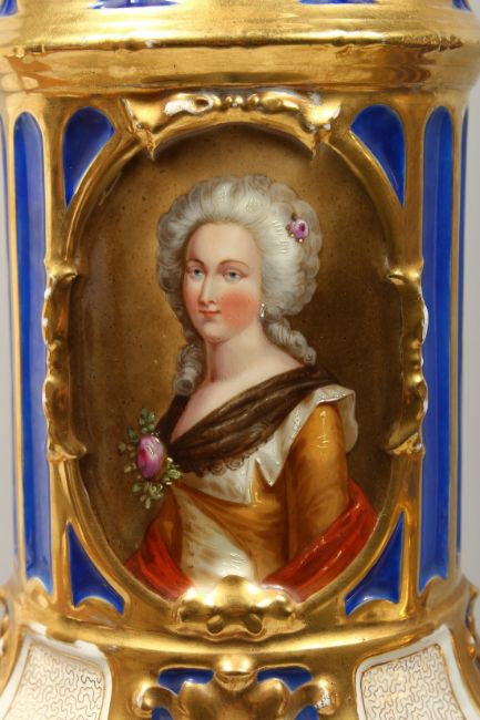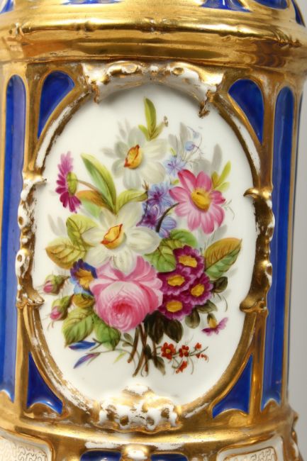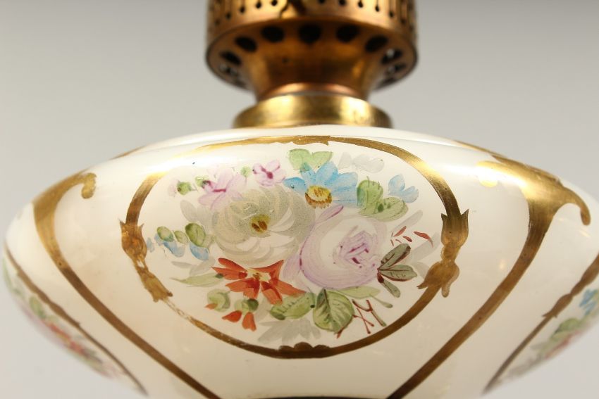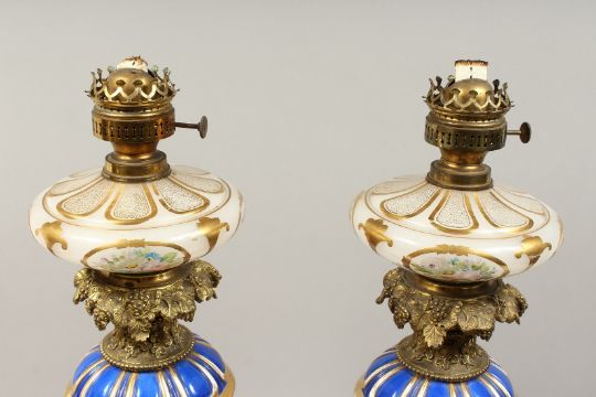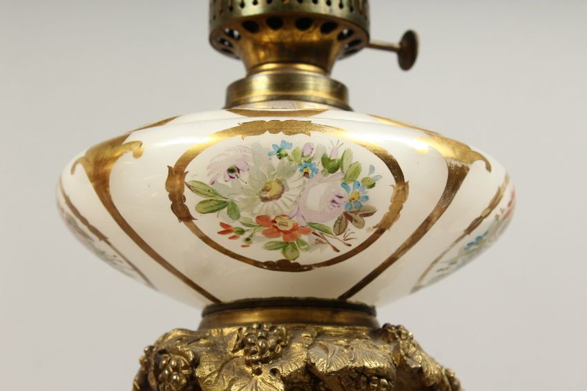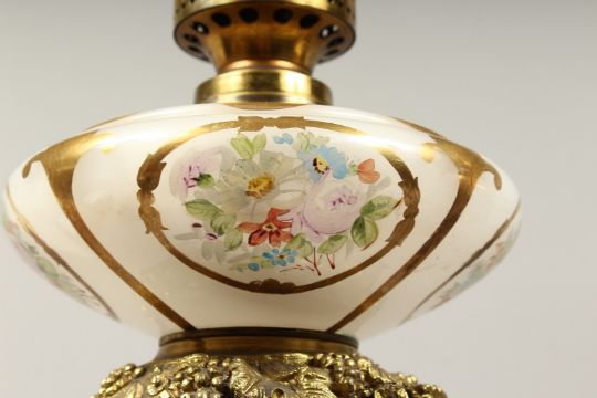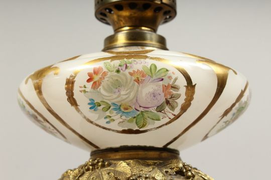 A SUPERB PAIR OF 19TH CENTURY FRENCH PORCELAIN AND GILT BRONZE LAMPS ON STANDS, painted with panels of flowers and reverse panels of portraits.