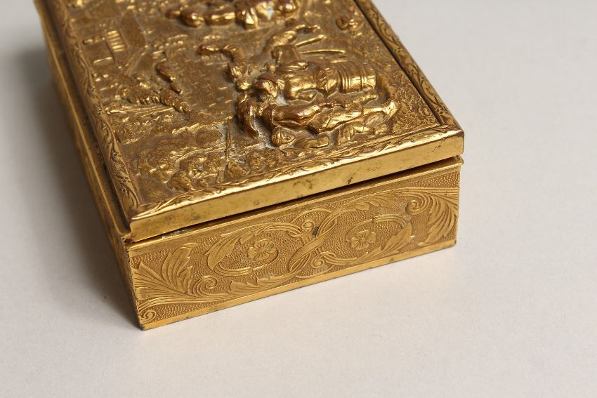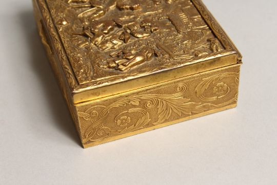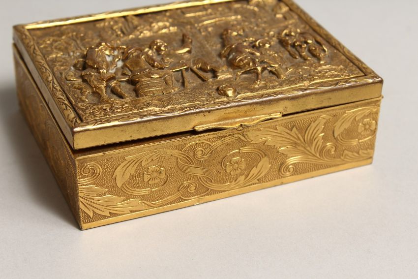 A FRENCH RECTANGULAR GILLDED METAL BOX, the lid with a tavern scene