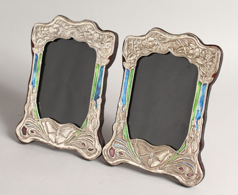 A PAIR OF SILVER AND ENAMEL ART NOUVEAU STYLE PHOTOGRAPH FRAMES