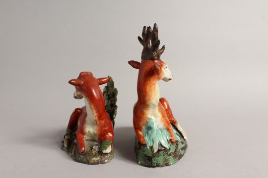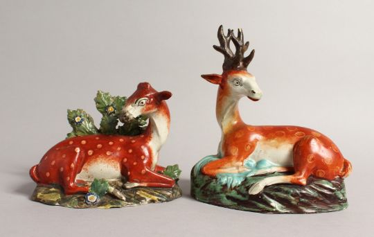 TWO LARGE STAFFORDSHIRE SEATED DEER with spots on rustic bases