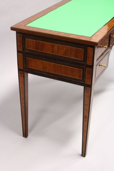 A MAHOGANY AND ROSEWOOD WRITING DESK, with green leathercloth writing surface, five drawers on tapering square legs