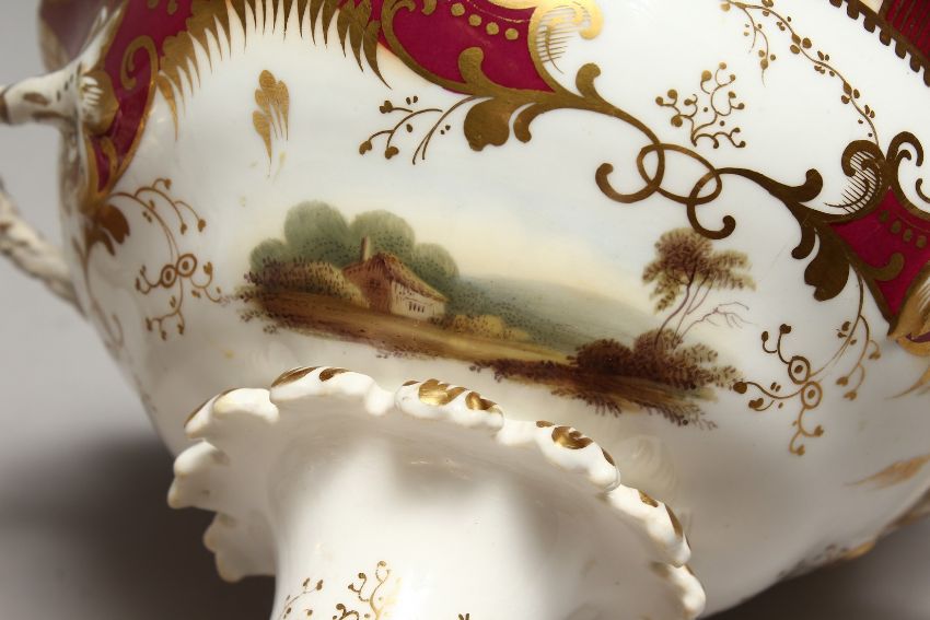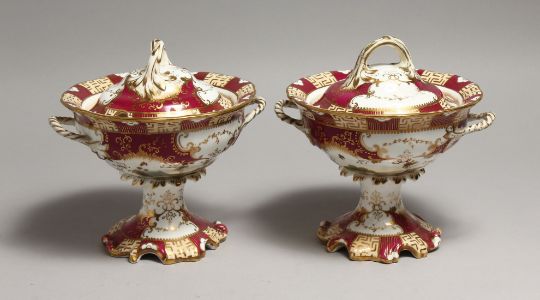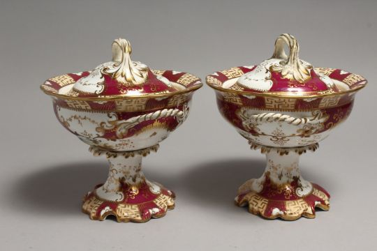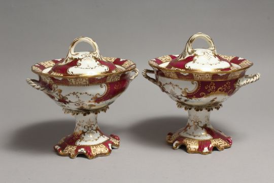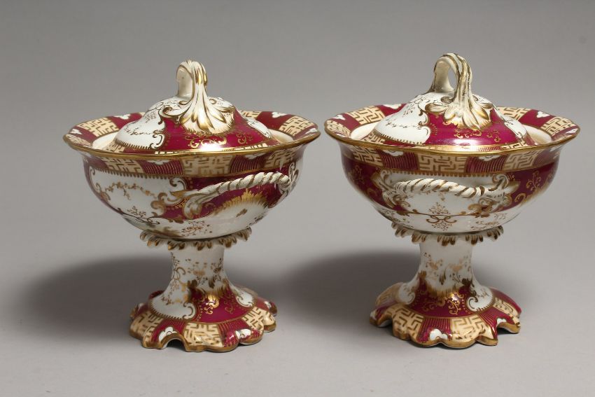A PAIR OF COALPORT TWO HANDLED BOWLS AND COVERS