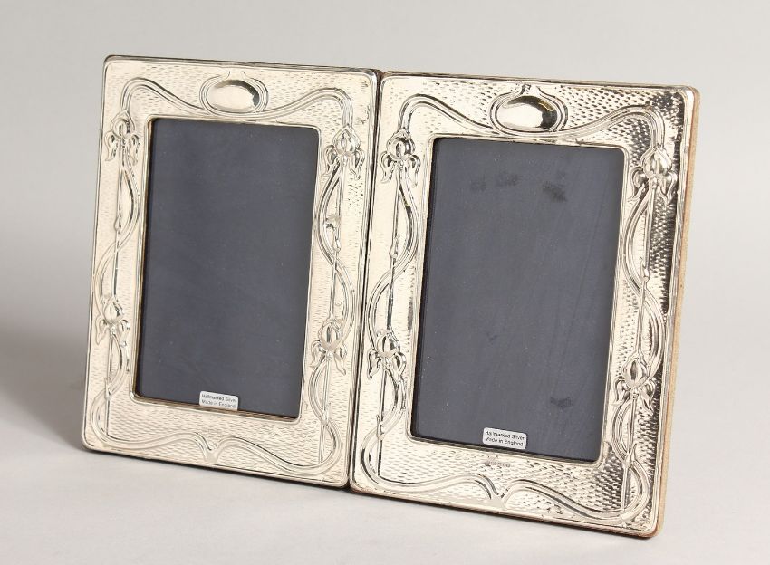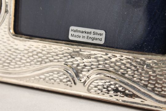 A PAIR OF SILVER ART NOUVEAU STYLE PHOTOGRAPH FRAMES.