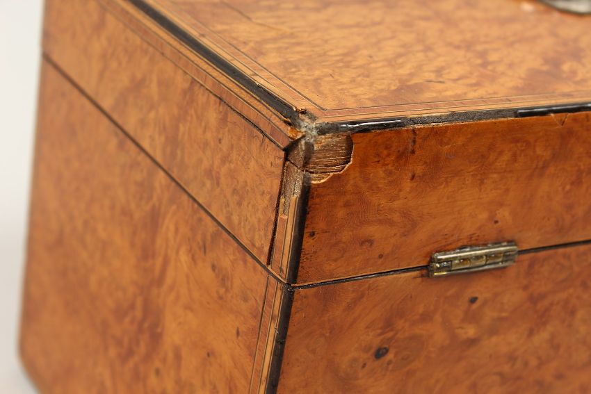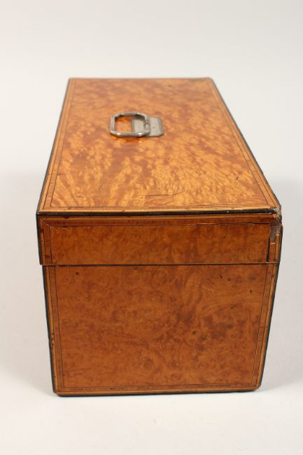 A LARGE GEORGE III POLLARD SATINWOOD TWO DIVISION TEA CADDY, banded top. silver plate handle.