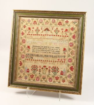 A GEORGE IV FRAMED AND GLAZED SAMPLER by Ellen Bell, Aged 9, 1827.