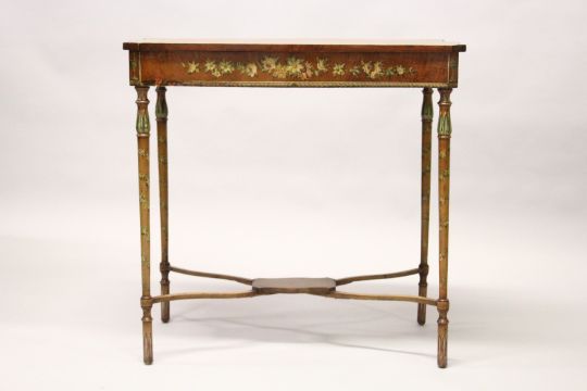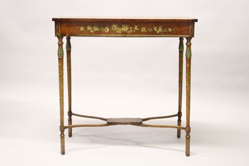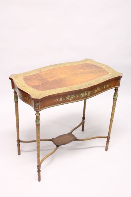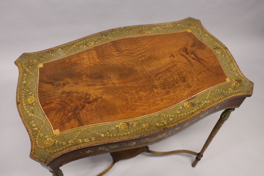 A GOOD EDWARDIAN SATINWOOD AND PAINTED OCCASIONAL TABLE of serpentine outline, the border, frieze and legs painted with bands of garlands, masks and flowers, the slender turned legs united by an under tier.