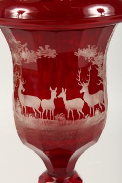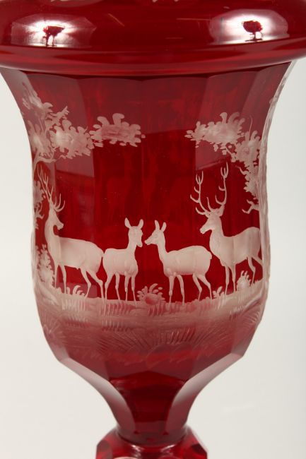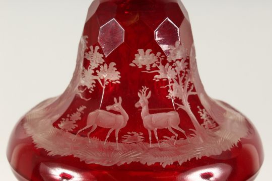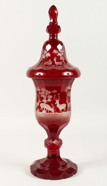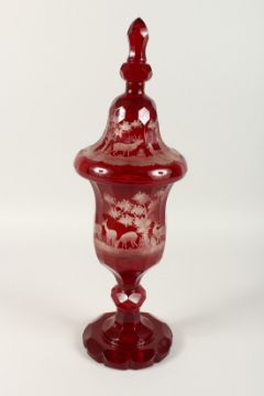 A SUPERB LARGE VICTORIAN BOHEMIAN RUBY GOBLET AND COVER etched with deer in a landscape.