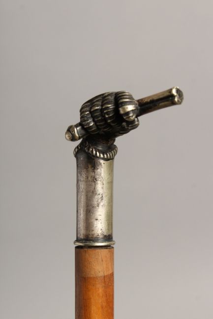 A 19TH CENTURY CANE with plated handles as a clenched fist holding a gun. Inscribed `RAYNER'