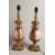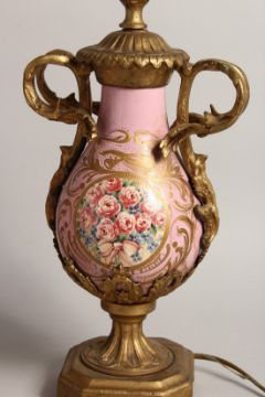 A GOOD PAIR OF 19TH CENTURY FRENCH PORCELAIN AND ORMOLU TWO HANDLED URNS, converted to lamps, painted with a panel of flowers