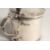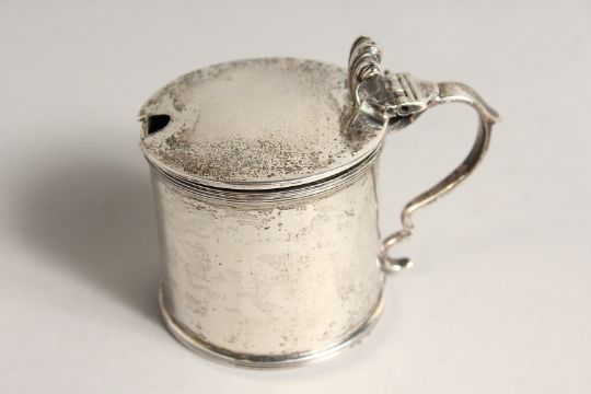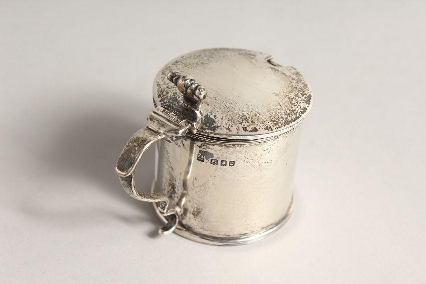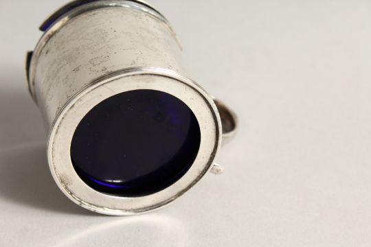 A DRUM SHAPED SILVER MUSTARD POT, with blue glass liner