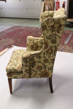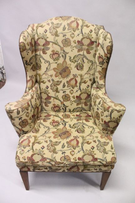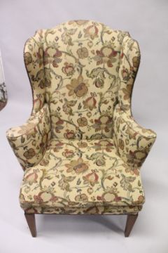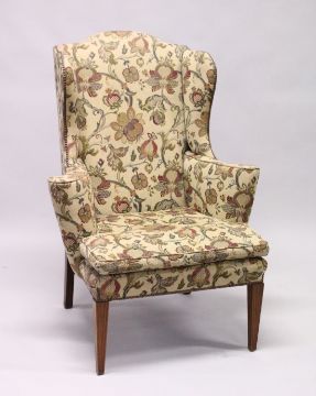 A GEORGIAN STYLE MAHOGANY WING ARM CHAIR with loose cushions on tapering legs.