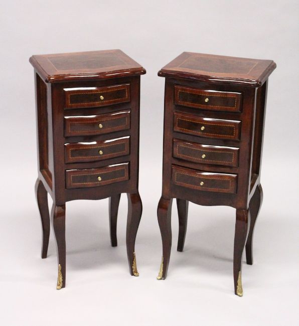 A PAIR OF FRENCH STYLE, MAHOGANY AND BURR WOOD FOUR DRAWER, SERPENTINE FRONTED BEDSIDE CHESTS