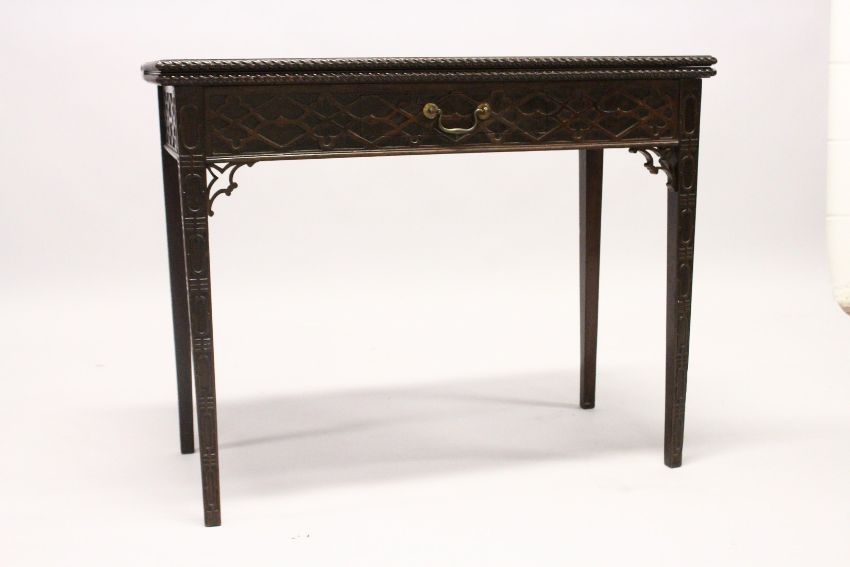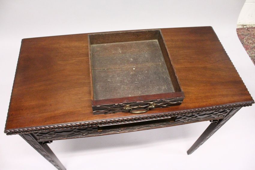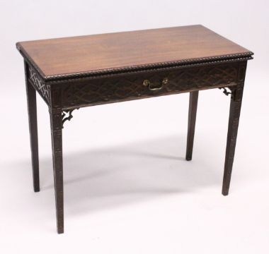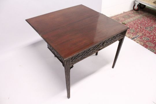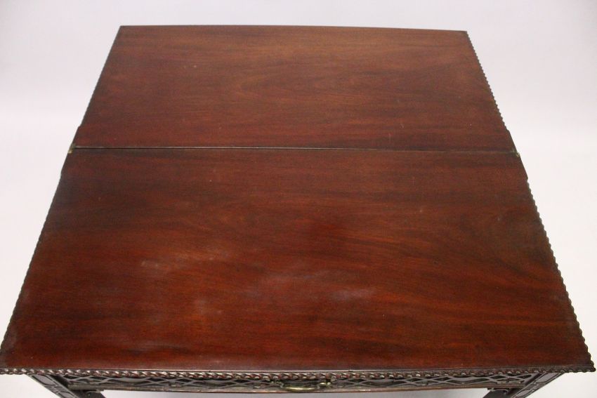 A GOOD GEORGE III MAHOGANY RECTANGULAR FOLDING TOP TEA TABLE with blind fret, curving and single drawer.