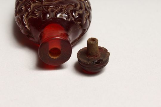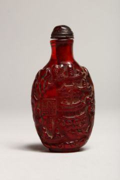 A SNUFF BOTTLE DECORATED WITH CHINESE TEMPLE SCENES, TREES, AND FIGURES IN BOATS, probably moulded resin.