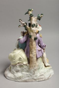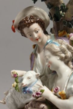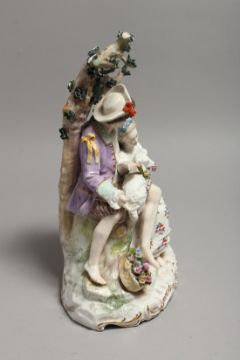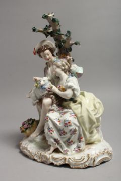 A LARGE 19TH CENTURY GERMAN PORCELAIN GROUP, boy and girl with a lamb, with encrusted with flowers and shaped oval base.