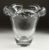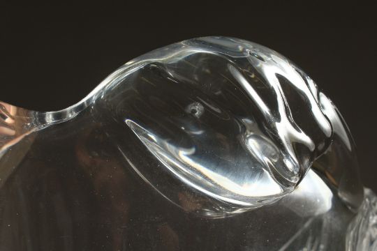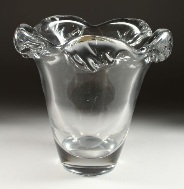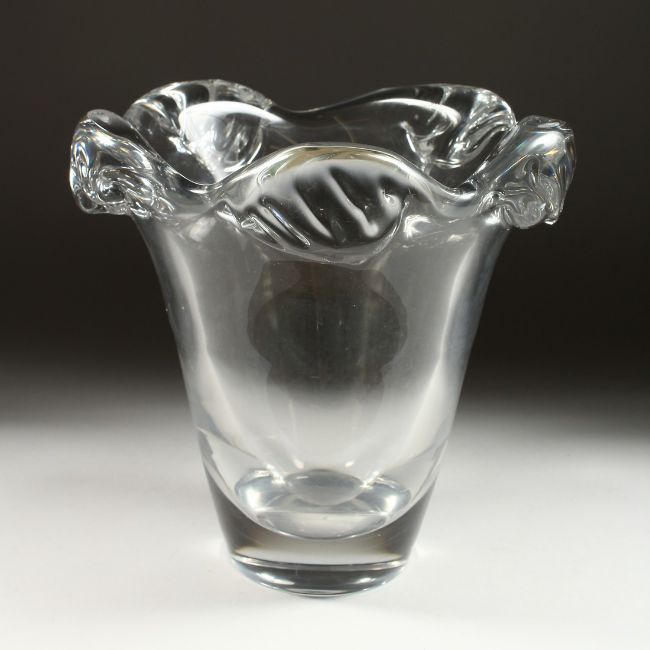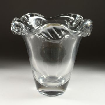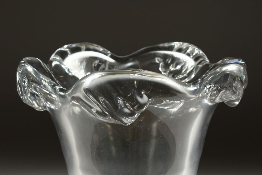 A LARGE HEAVY PLAIN GLASS VASE, the lip as scrolling waves
