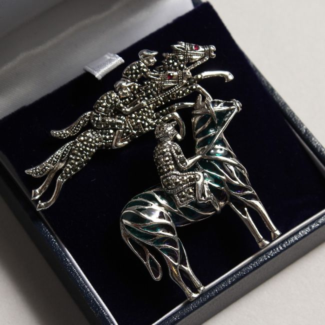 A PAIR OF SILVER MARCASITE HORSE AND JOCKEY BROOCHES