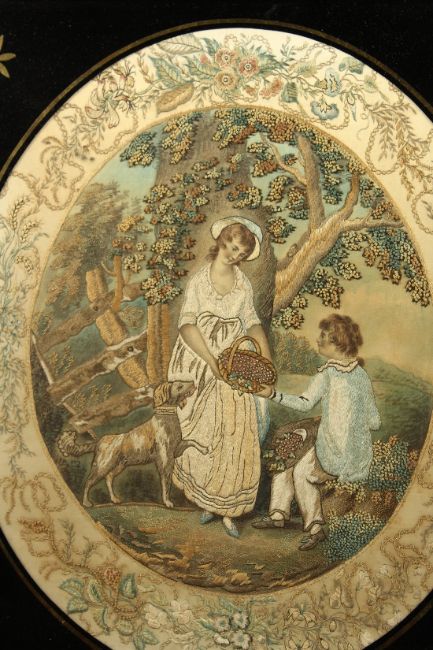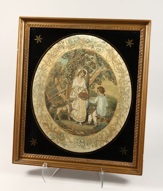 A GEORGIAN SILKWORK FRAMED AND GLAZED OVAL PICTURE of a young lady, boy and dog.