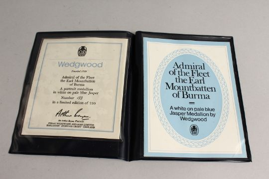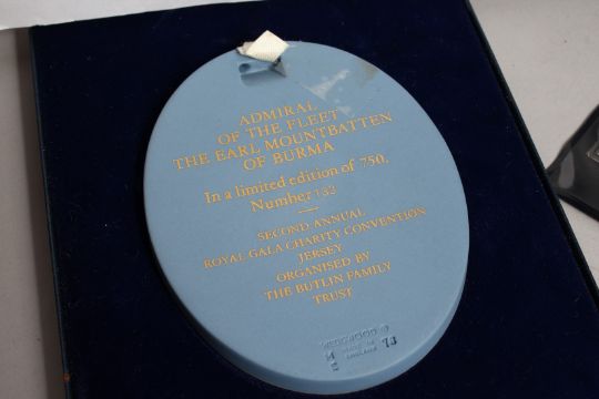 A WEDGWOOD BLUE AND WHITE OVAL PLAQUE " THE EARL MOUNTBATTEN OF BURMA " , in box.